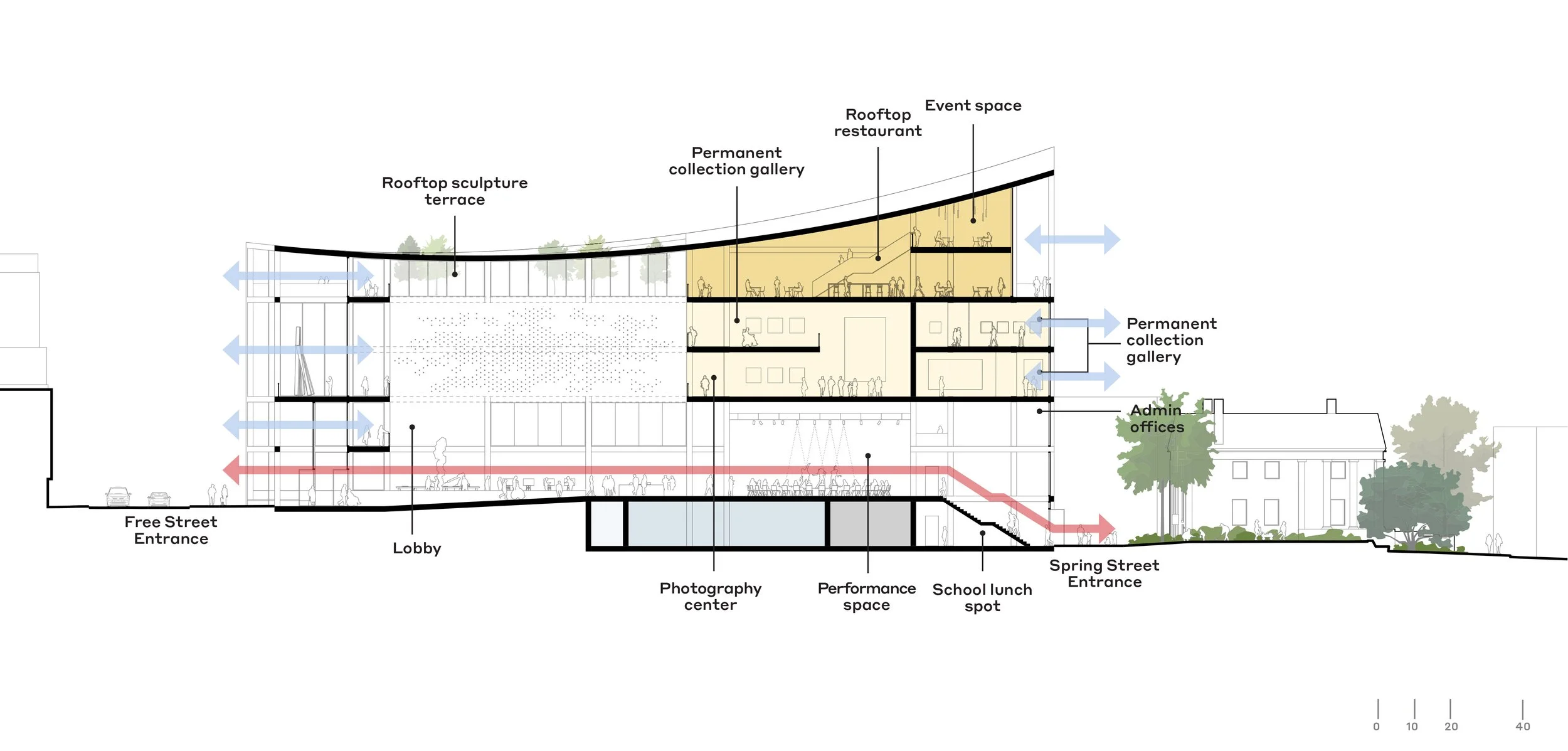 To unify the campus, our design removes barriers and meaningfully integrates the museum’s site with the life of the City. A proposed interior “Free Street” and the adjoining landscapes form the connective tissue that unites eclectic buildings and programs across the two-acre campus. The reimagined sculpture court becomes a light-filled, universally accessible plaza: a celebratory entry to new, flexible performance and creative spaces.